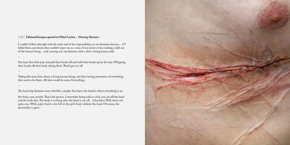 These photographs emerge from, and seek to return to, a moment of timelessness, in which the body is opened and recontextualised. To view these pictures, the variety of injuries on display, is to be compelled to look. Yet this gaze is not seeking a revelatory moment, the sheer overwhelming selection of images prohibits the ready consumption of a singular truth. Instead each demands a new engagement from the viewer. Each text pushes thought in new directions. The series becomes a cycle of flesh hieroglyphs. Each injury becomes the source of its own meaning.